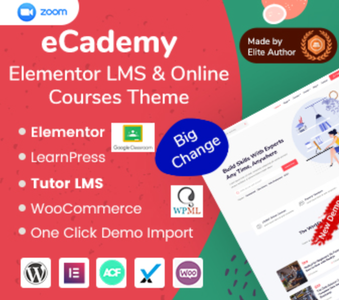 eCademy WP teması, canlı sınıflar için Zoom eklentisi desteği ile birlikte gelir.